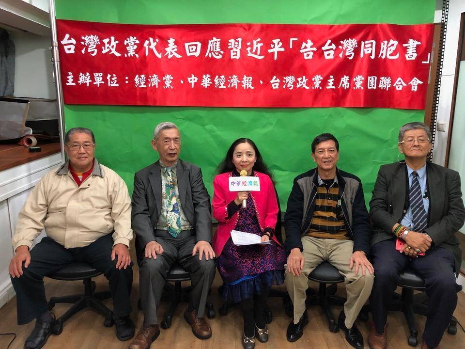 ▲2019年 1月5日經濟黨主席张采明召集超過43個政黨與政治團體,針對習近平主席告台灣同胞書40週年的談話聯合發表聲明。照片中為經濟黨主席張采明,左一為時任台灣新住民福利黨主席歐陽台,左二為時任中華同興黨吳開疆主席,右一為時任中國天同黨主席邵伯祥,右二為時任中國民主憲政黨主席陳首。(照片出處:經濟黨官網)